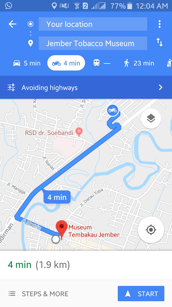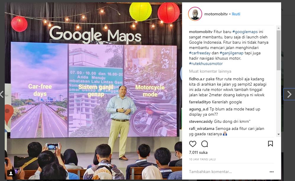 Memang tidak sedikit pengguna google map adalah pengendara speda motor. Maka tentunya fitur terbaru ini akan menjadi sangat membantu, karena di kota-kota besar ada beberapa jalur yang tidak boleh dilalui oleh pengendara speda motor. Pengalamanku sendiri juga terkadang sedikit was-was ketika mencari jalan menggunakan mode Car karena tekut keliru jalur.