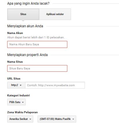 - Mengisi semua daftar data pribadi yang diminta Google Analytics. Hal ini untuk bisa mendapatka kode pelacarakn atau tracking code. Data yang perlu diisi diantaranya adalah nama akun, nama situs, url, Kategori dan Zona waktu.
