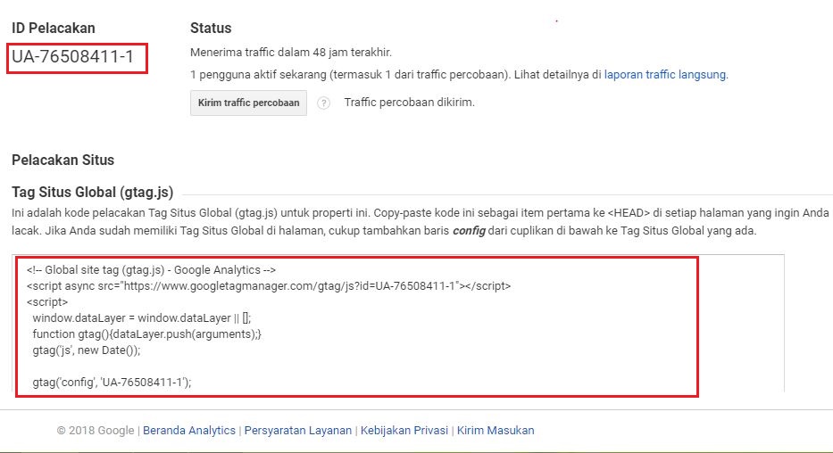 Setelah selesai mengklik tombol Get Tracking ID sahabat akan mendapatkan popup term and condition google Analytics yang harus disetujui. Setelah disetujui akan muncul kurang lebih seperti ini.
