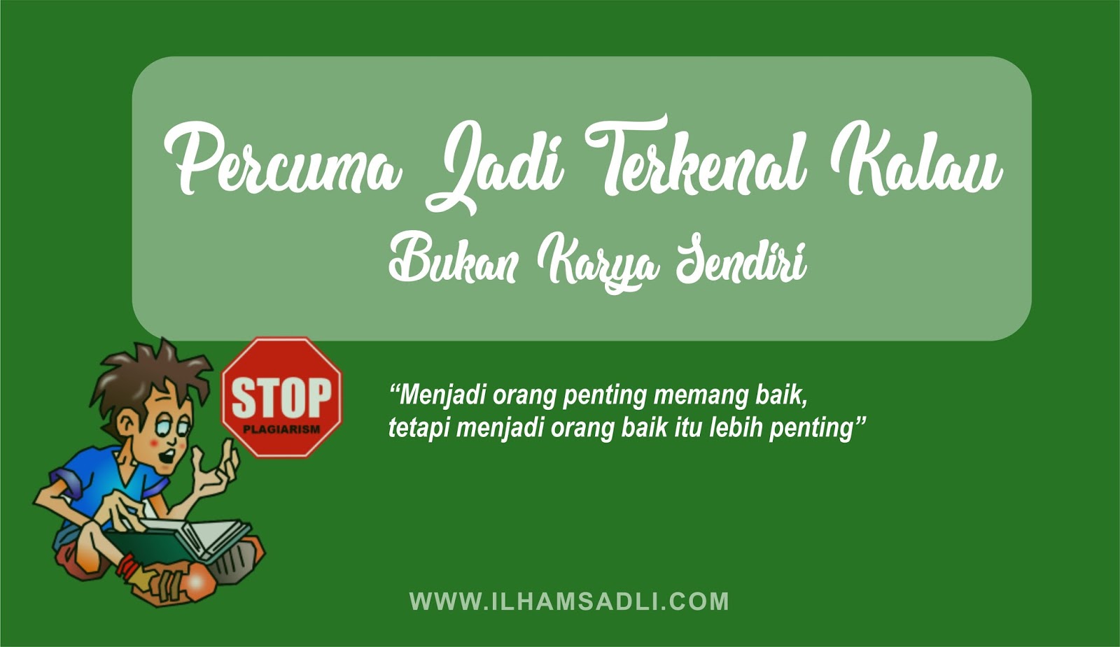 Ilhamsadli.com,- Semua orang ingin jadi terkenal dan mulai dikenal. Tetapi semuanya butuh proses yang panjang untuk bisa memetik hasil tersebut. Sukses cara instan memang ada dan marak sekali, terutama di dunia maya. Banyak yang hanya menginginkan untuk jadi terkenal, hingga lupa mengenai kualitas dirinya. Menghalalkan segala cara hingga menjiplak karya orang lain, please Stop Plagiarisme.