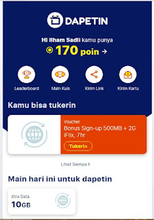 Selain mendapatkan kuota ketika melakukan pendaftaran, sahabat juga berkesempatan untuk mendapatkan hadiah dari Dapetin. Untuk pengumpulan poin bisa di dapatkan dengan mengundang teman bergabung dalam program dapetin, menjawab kuis.