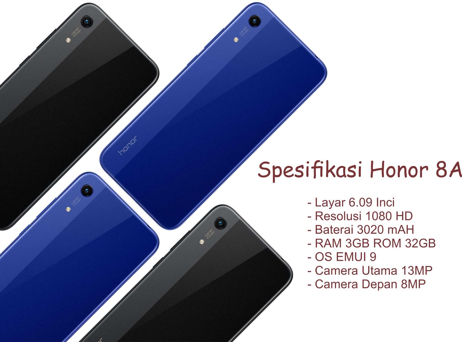 Untuk spesifikasi Honor 8A, berikut akan saya tampilkan detailnya. Smartphone Honor 8A ini berukuran 6.09 inci dengan rasio 19,5 : 9. Honor 8A ini juga dibekali chipset MediaTek Helio P35 dengan tambahan RAM 3GB dan intrenal 32 GB. Camera Honor 8A ini mengadopsi dewdrop untuk homecamera dengan resolusi 8 MP dengan lensa f/2.0. Camera utama atau camera belakang tunggal beresolusi 13 MP dengan lensa f.1.8 dengan OS Android 9 dan EMUI 9.