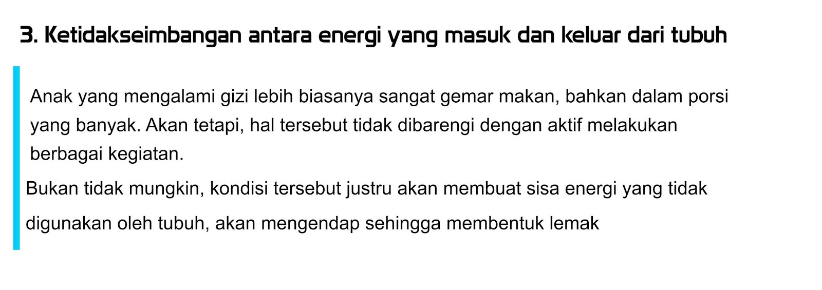 Kondisi ini dapat disebabkan oleh asupan nutrisi harian yang terlampau banyak, sehingga malah melebihi kebutuhan harian anak.