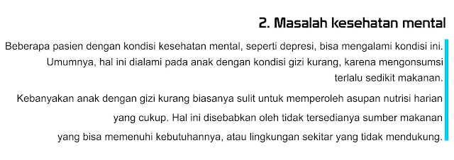 Dan soal malnutrisi, ternyata rambut rontok dan mudah marah itu juga termasuk salah satu gejala. Dan banyak juga, ya, penyebabnya kesehatan mental juga. Harus perbaiki pola makan, nih, supaya bisa menghindari malnutrisi.