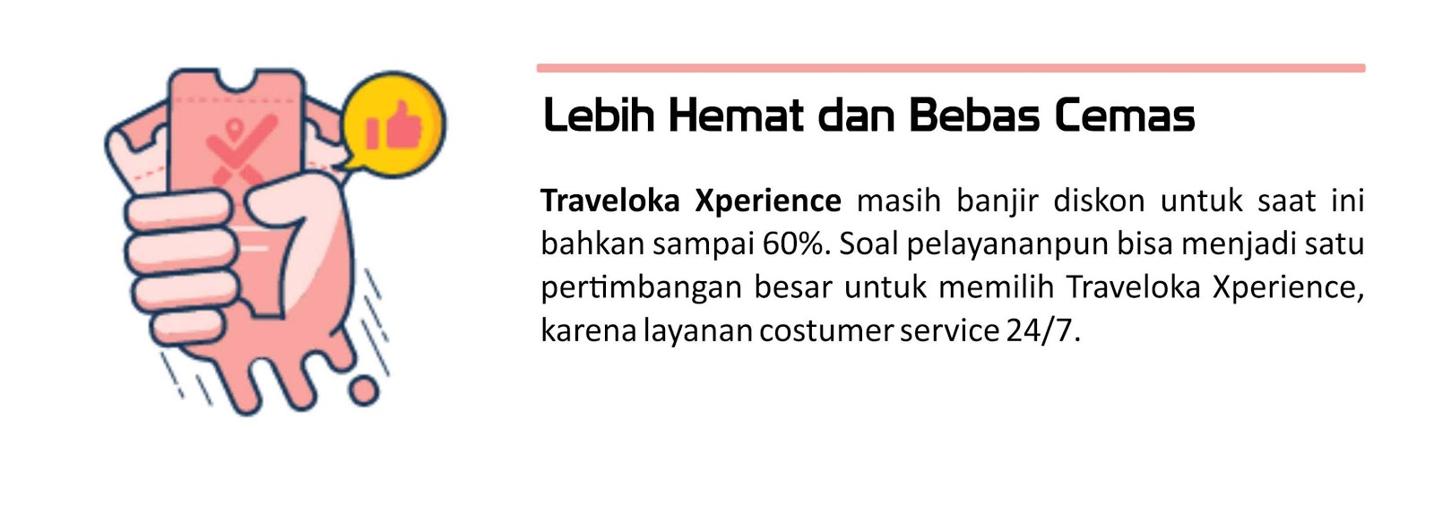 Soal pelayananpun bisa menjadi satu pertimbangan besar untuk memilih Traveloka Xperience, karena layanan costumer service 24/7. Jadi tidak perlu cemas jika ada yang membingungkan, bisa menghubungi costumer service dan menunggu responnya saja. Asli bisa bikin bebas cemas dan bebas khawatir.