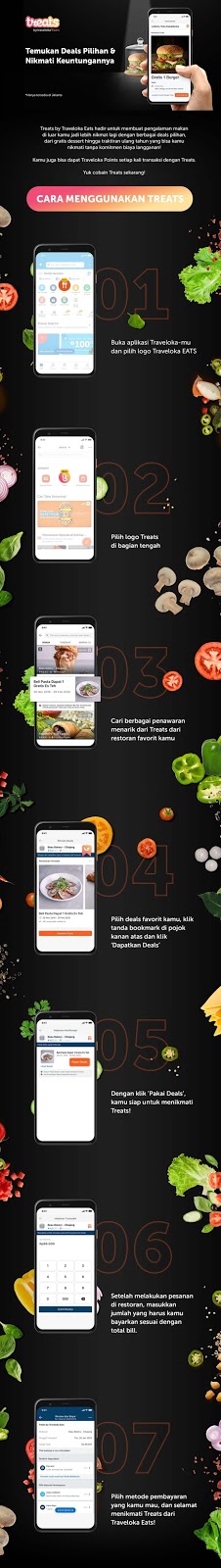 Treats by Traveloka Eats hadir untuk membuat pengalaman makan di luar kamu jadi lebih nikmat dengan berbagai deals pilihan, dari gratis dessert hingga traktiran ulang tahun yang bisa kamu nikmati tanpa komitmen biaya langganan! Bagaimana cara menggunakannya? Simak Foto berikut ini.![]() |