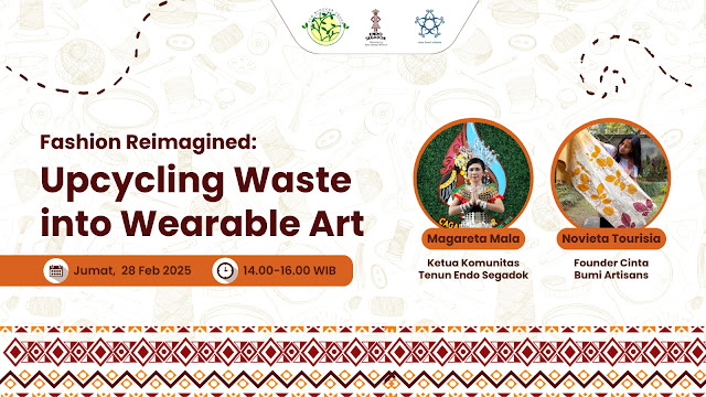 Workshop dengan tema Fashion Reimagined : upcycling Waste into Wearable Art dengan menghadirkan kak Margaretha Mala selaku ketua komunitas Tenun Endo Segadok dan kak Novieta Toutisia selaku Founder Cinta Bumi Artisans. Penyampaian pertama oleh kak Margareta menyampaikan banyak hal termasuk salah satunya adalah bagaimana menenun adalah sebuah tradisi Suku Dayak iban yang diwariskan oleh leluhur.